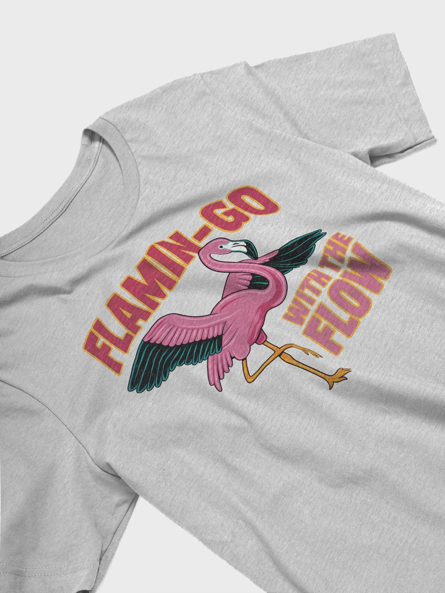 Embrace your quirky side with this vibrant t-shirt featuring a playful pink flamingo ready to "Flamin-go With The Flow". Perfect for adding a splash of fun and motivation to your wardrobe!