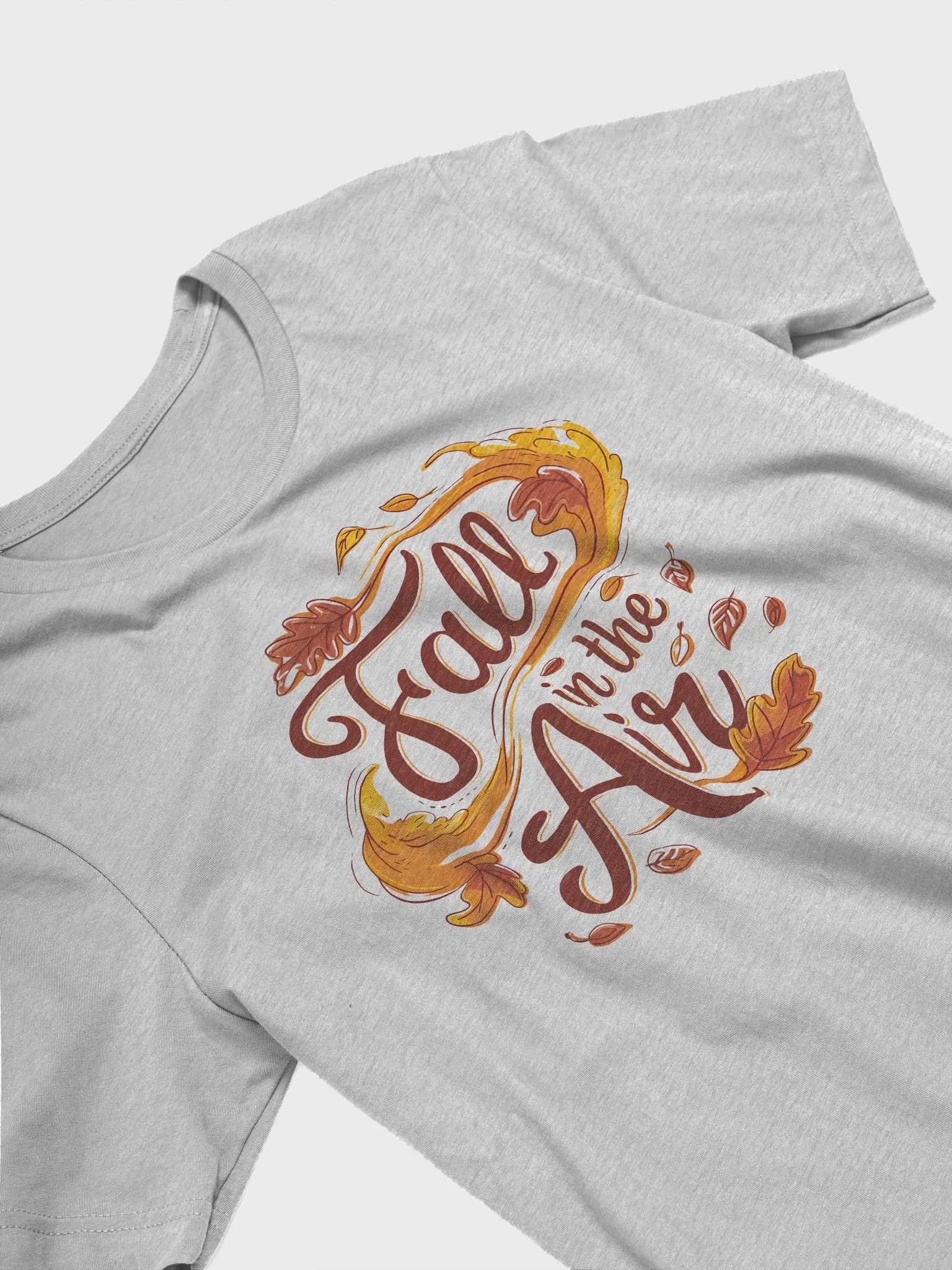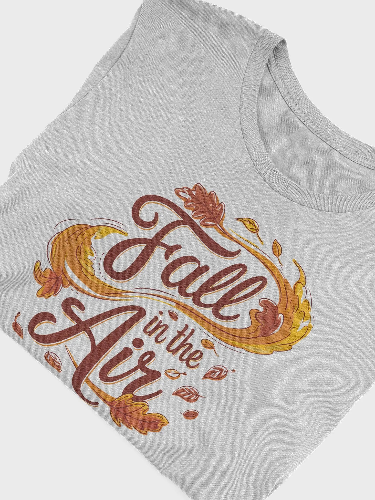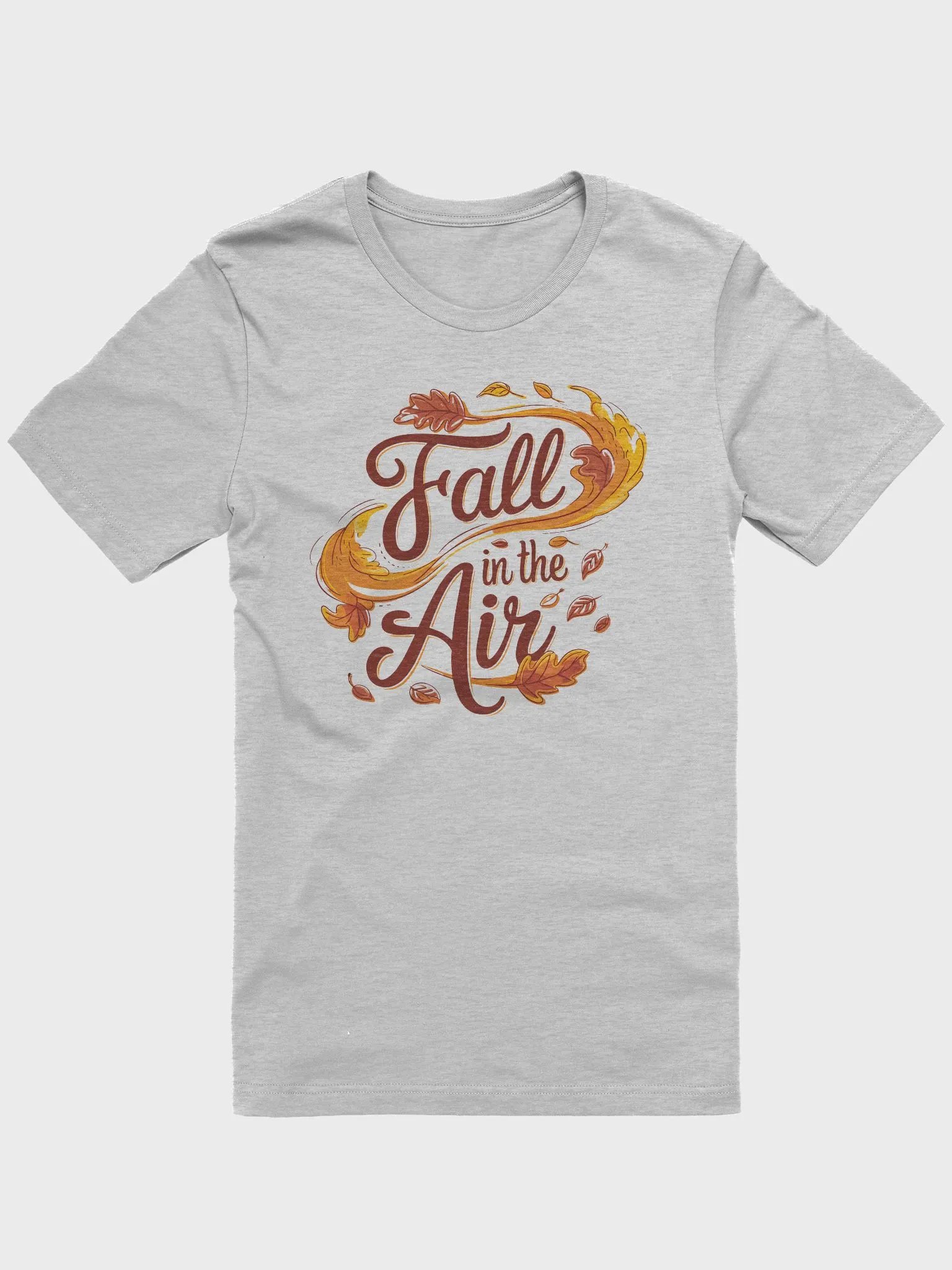 Embrace the season with this autumn-themed ‘Fall in the Air’ t-shirt. Featuring elegant script surrounded by whimsical swirls and falling leaves in warm tones of orange, yellow, and brown, this tee adds a touch of autumnal charm to your wardrobe. Perfect for those crisp fall days.