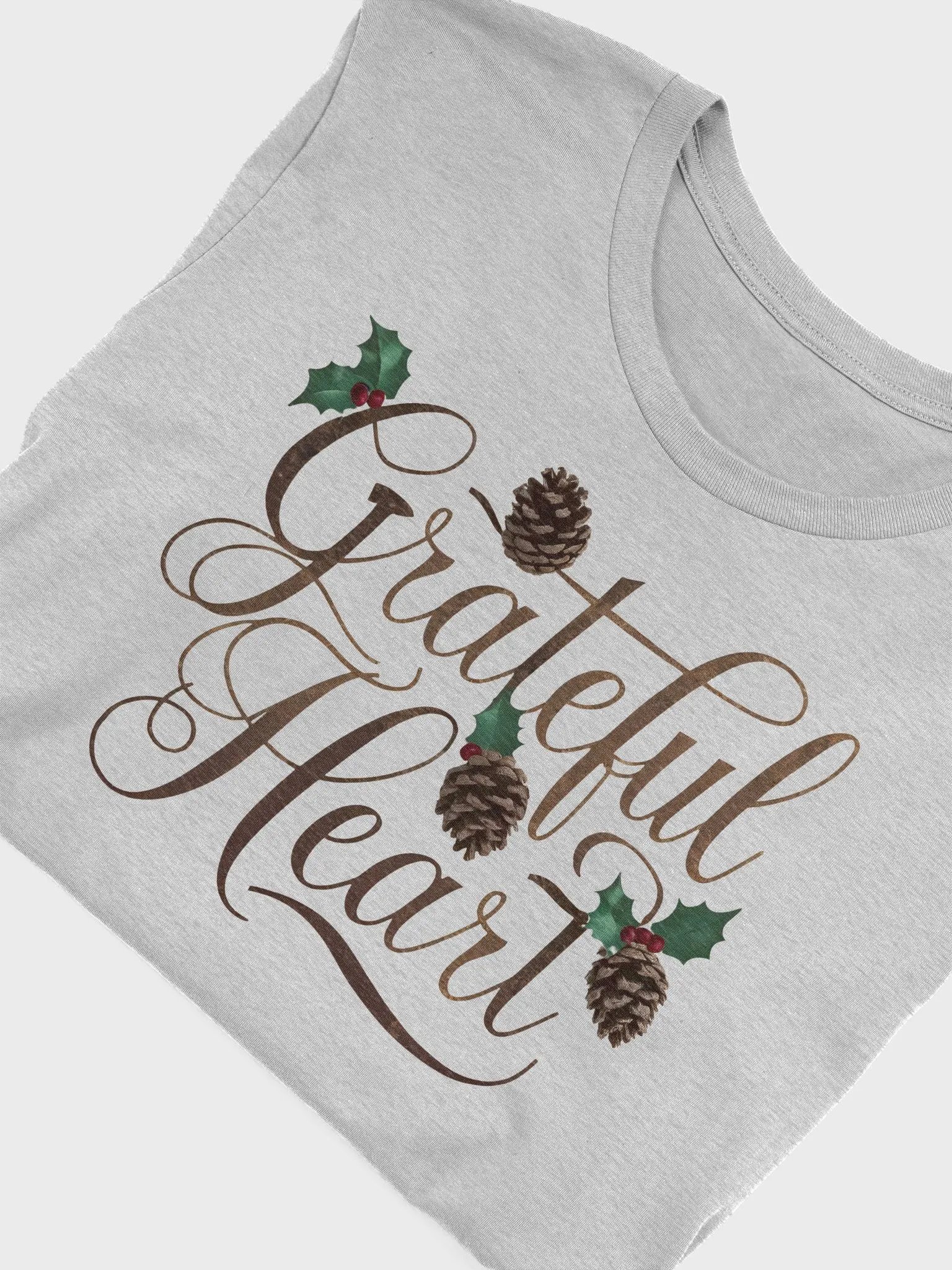 Embrace the spirit of the season with this elegant ‘Grateful Heart’ t-shirt. Featuring stylized cursive lettering in a rich brown hue, adorned with festive holly leaves and pine cones, this design captures the essence of thankfulness and holiday cheer.