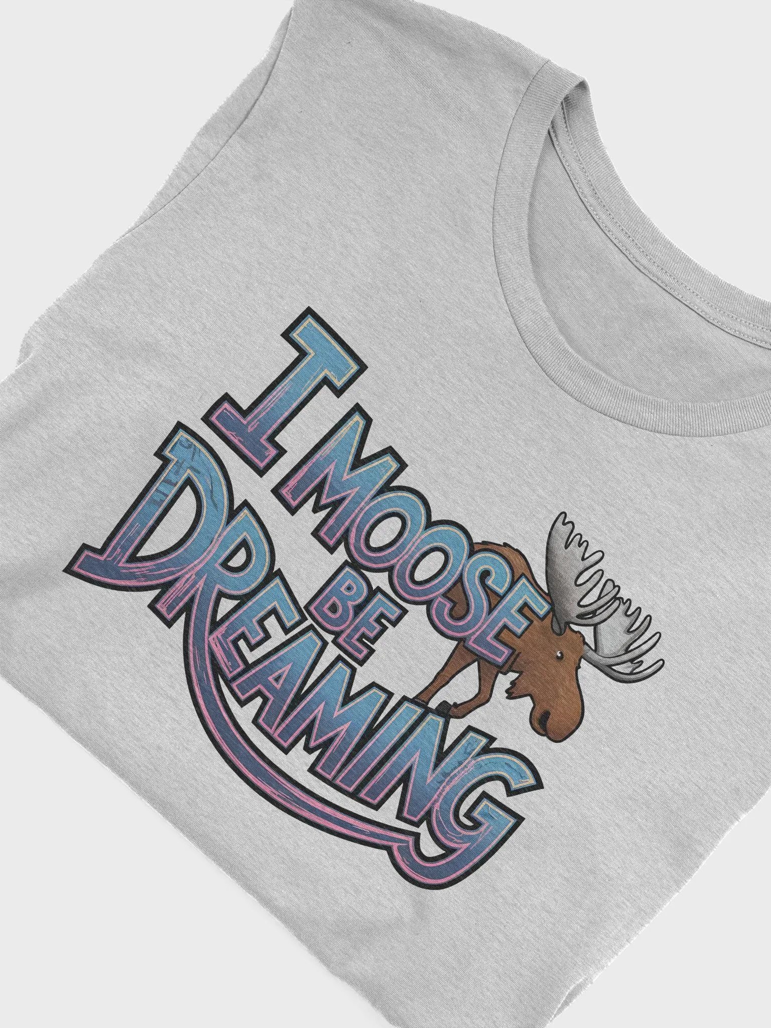 Embrace your wild side with this playful t-shirt featuring the whimsical phrase "I MOOSE BE DREAMING" in bold, gradient letters of blue and pink. The adorable moose illustration adds a touch of wilderness charm, making this tee perfect for those who love to combine inspiration with a giggle.