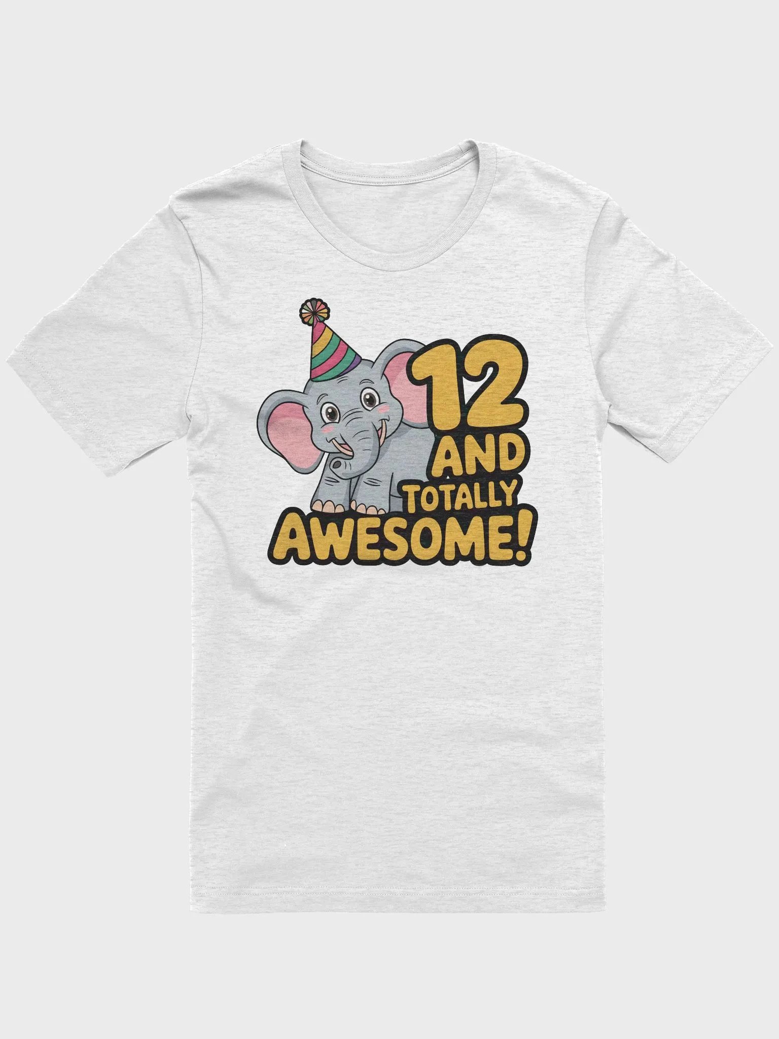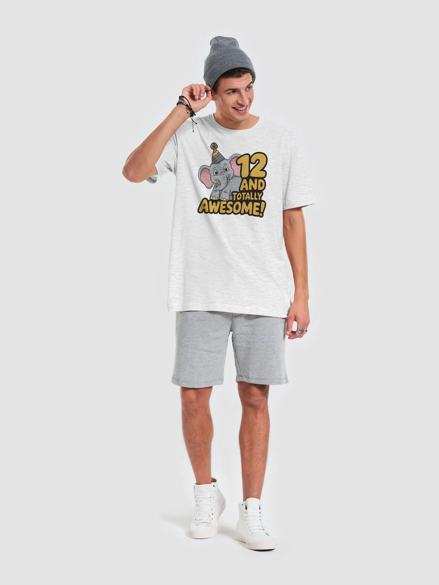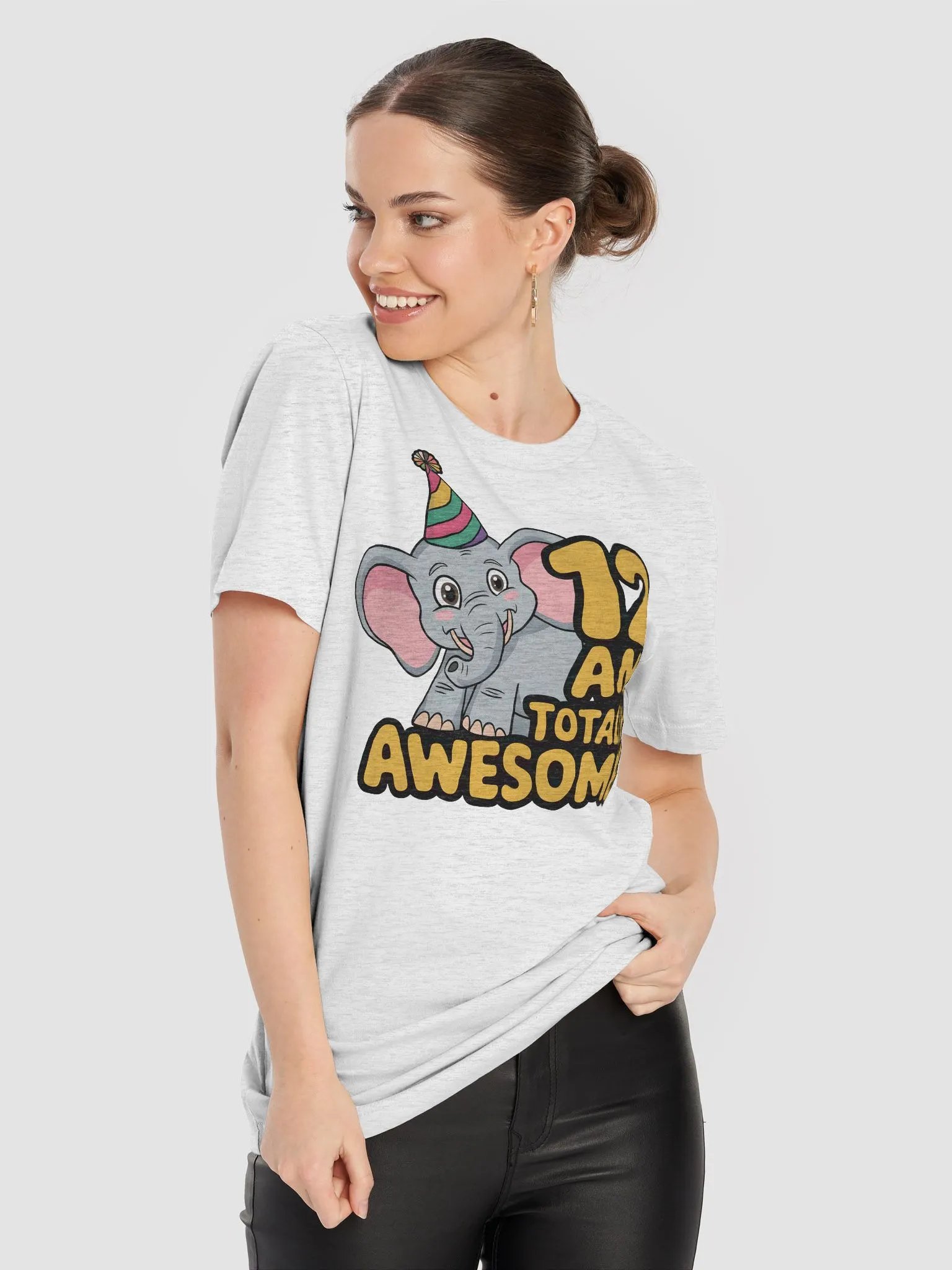 "12 AND TOTALLY AWESOME!" t-shirt, 12th birthday t-shirt, celebration apparel, cheerful cartoon elephant, milestone birthday shirt, joyful clothing for kids, funny outfit, unique birthday gift