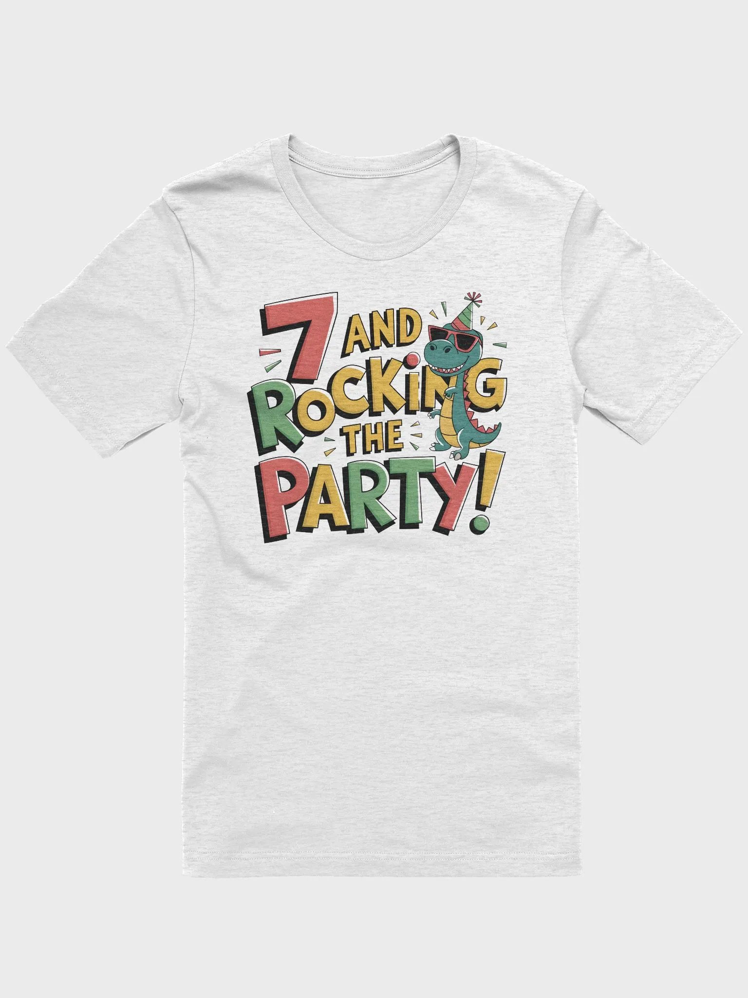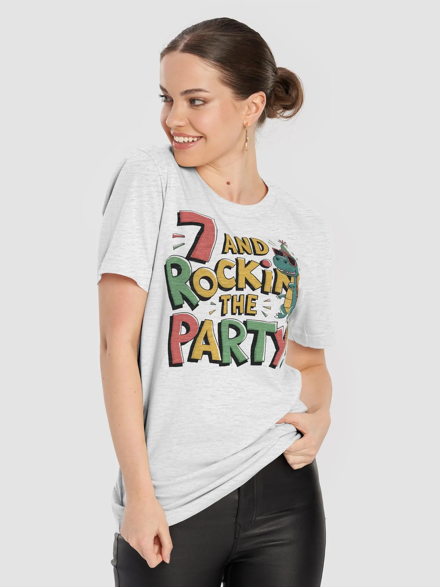 "7 AND ROCKING THE PARTY!" t-shirt, seventh birthday celebration, dinosaur birthday shirt, kids party apparel, 7th birthday clothing, festive dinosaur print, stylish kids t-shirt, unique birthday gift