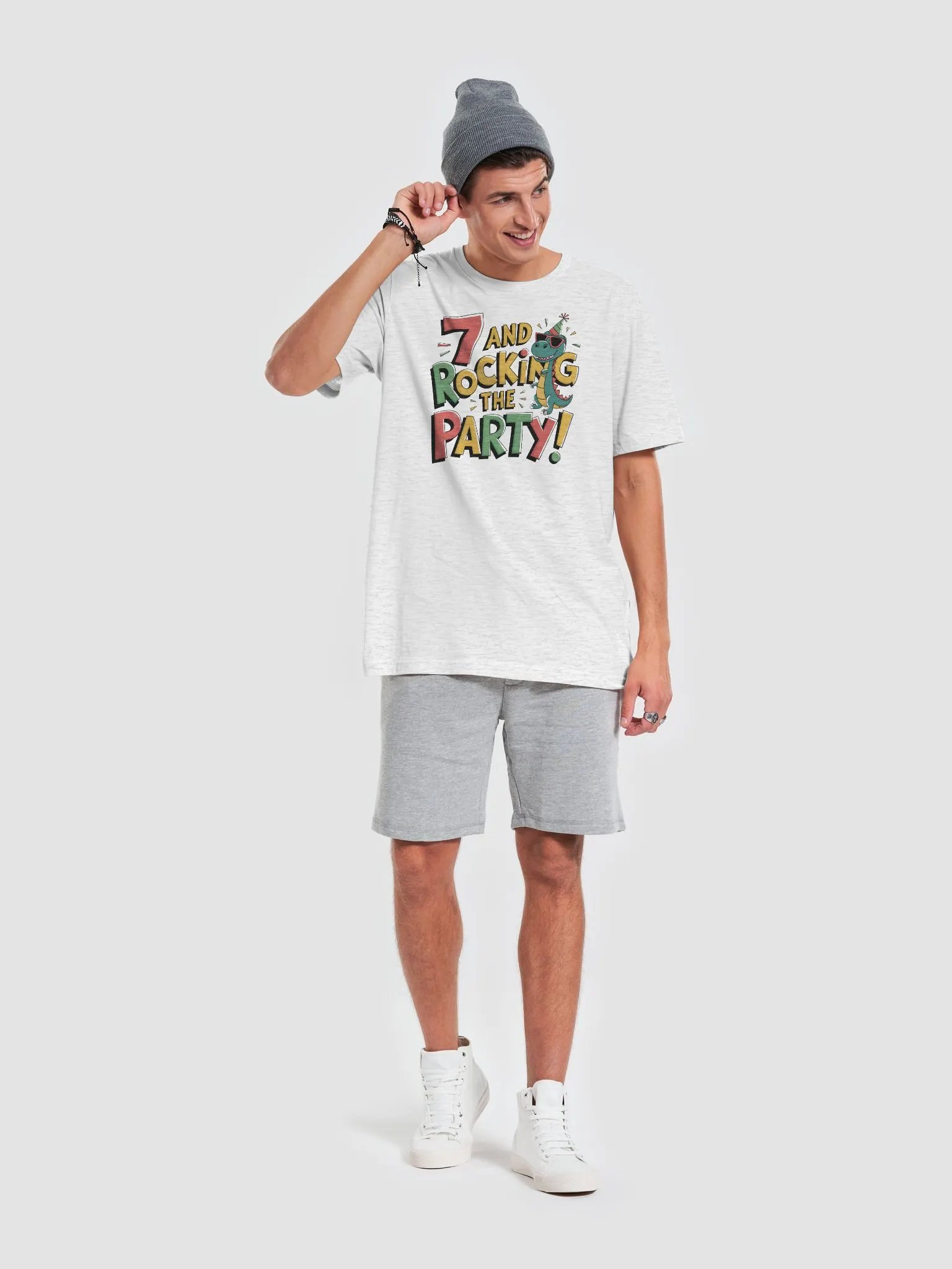 "7 AND ROCKING THE PARTY!" t-shirt, seventh birthday celebration, dinosaur birthday shirt, kids party apparel, 7th birthday clothing, festive dinosaur print, stylish kids t-shirt, unique birthday gift Size Guide