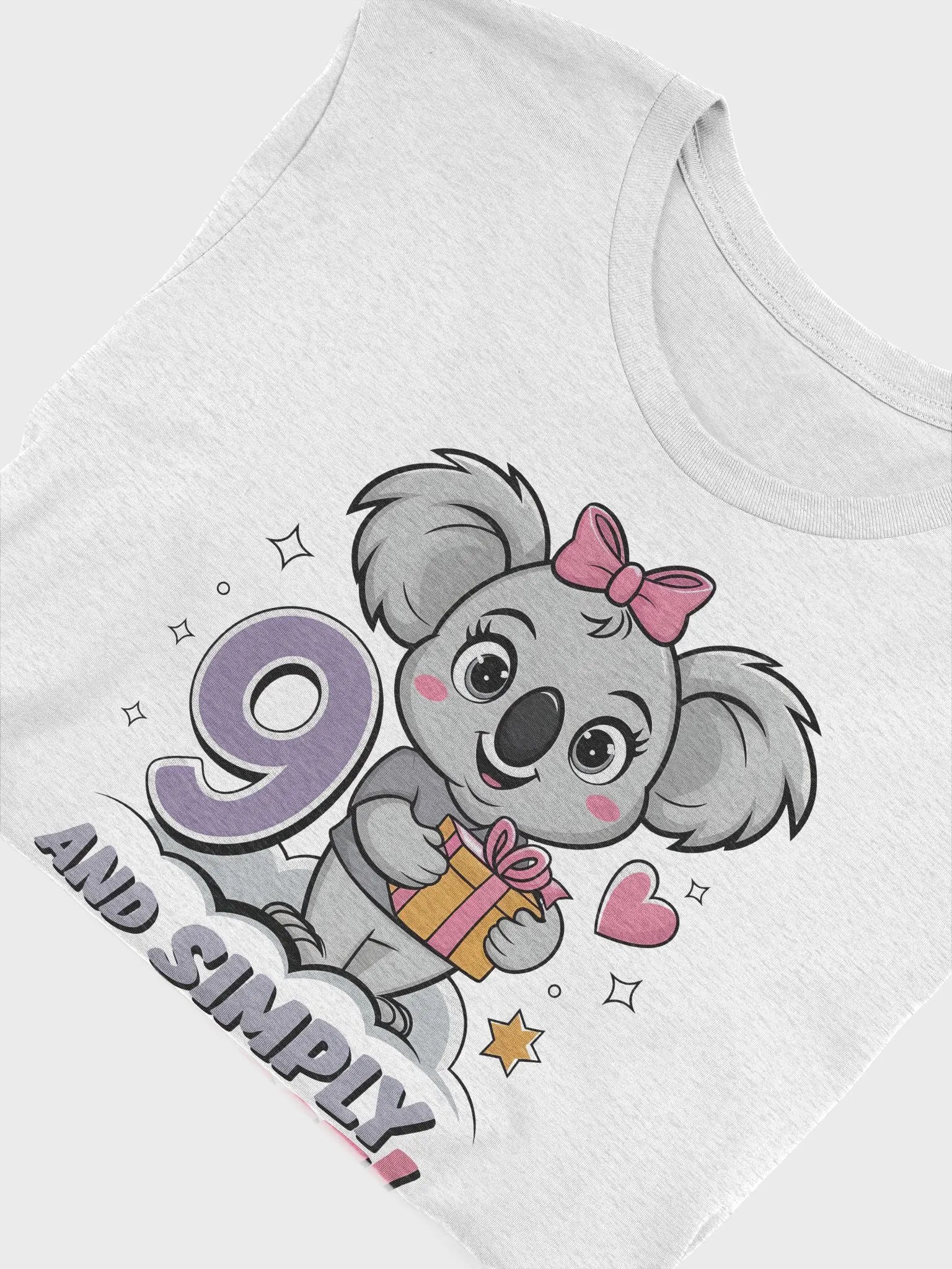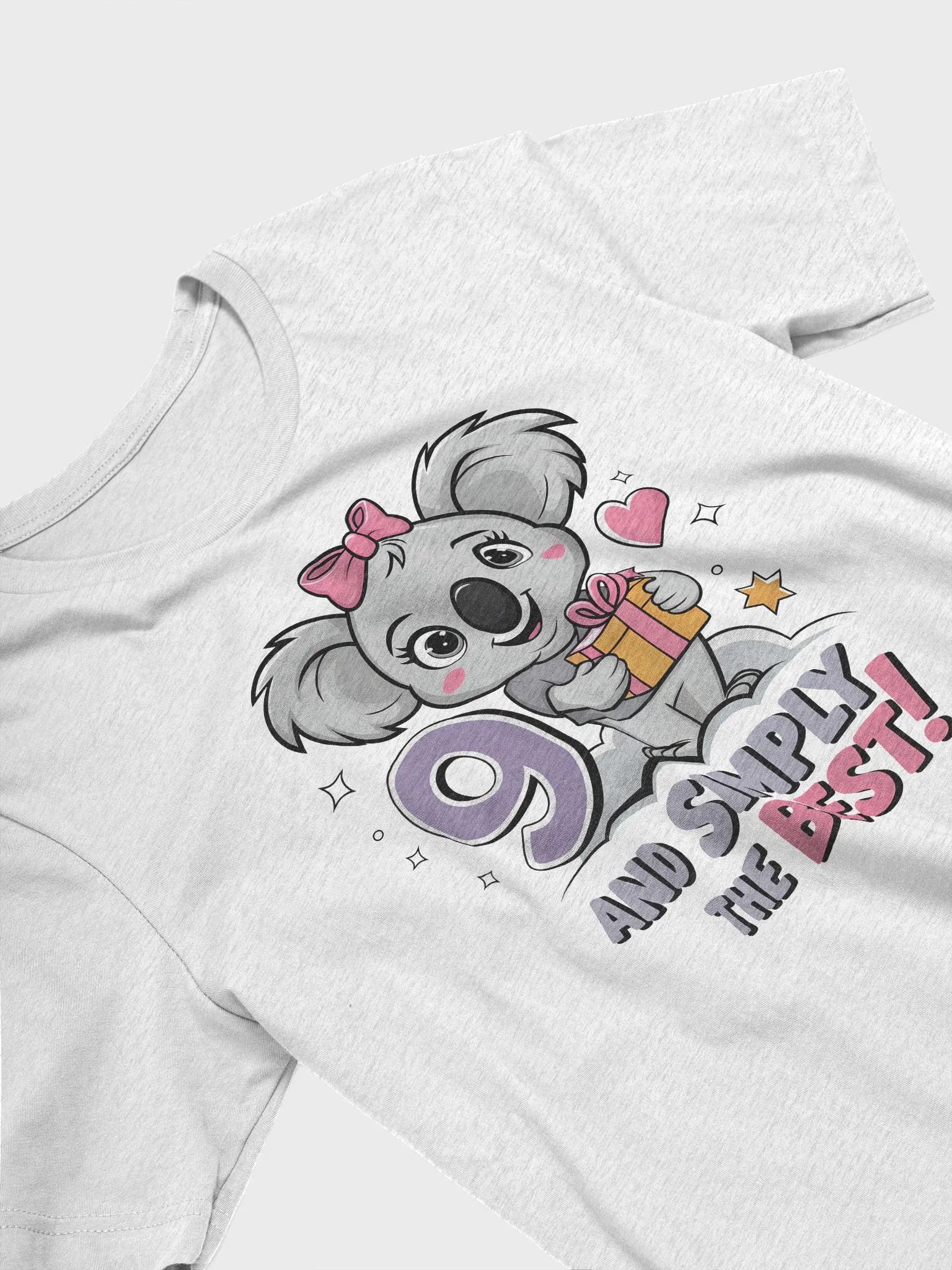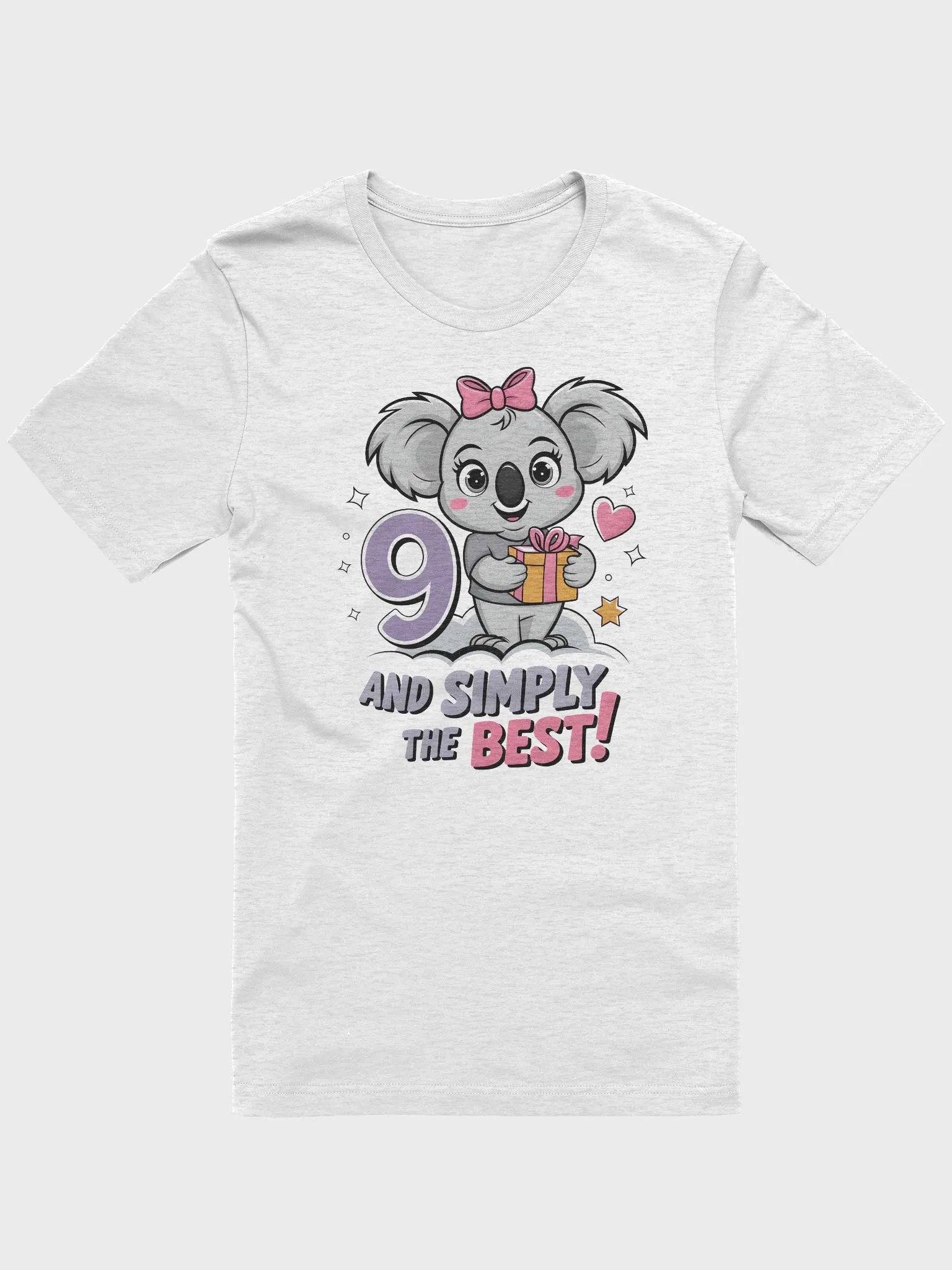 Celebrate in style with our "9 AND SIMPLY THE BEST!" t-shirt! Perfect for anyone turning nine or just feeling fabulous. This vibrant design features a playful koala holding a gift, sitting on a cloud, surrounded by stars and hearts. It’s not just a t-shirt; it’s a statement of joy and celebration!