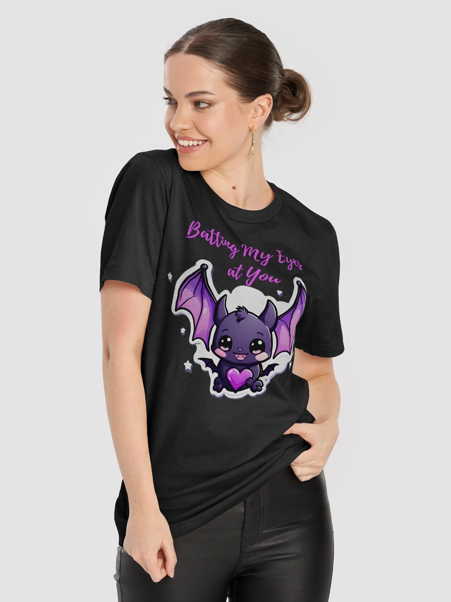Get into the Halloween spirit with this playful t-shirt featuring the phrase ‘Batting My Eyes at You’ in a whimsical purple font. The design includes an adorable bat with large purple wings and a heart-shaped body, making it perfect for adding a touch of spooky charm to your wardrobe.
