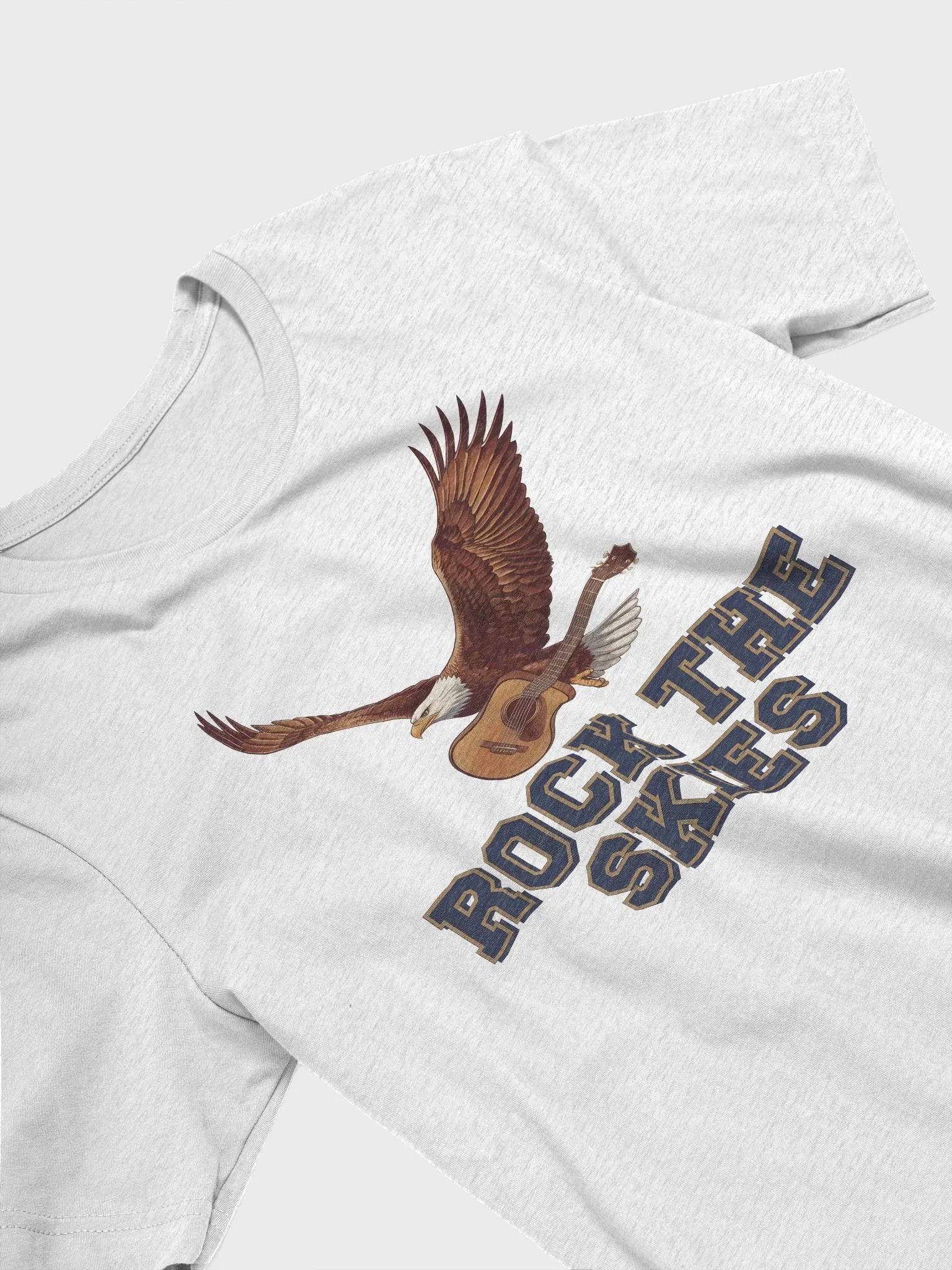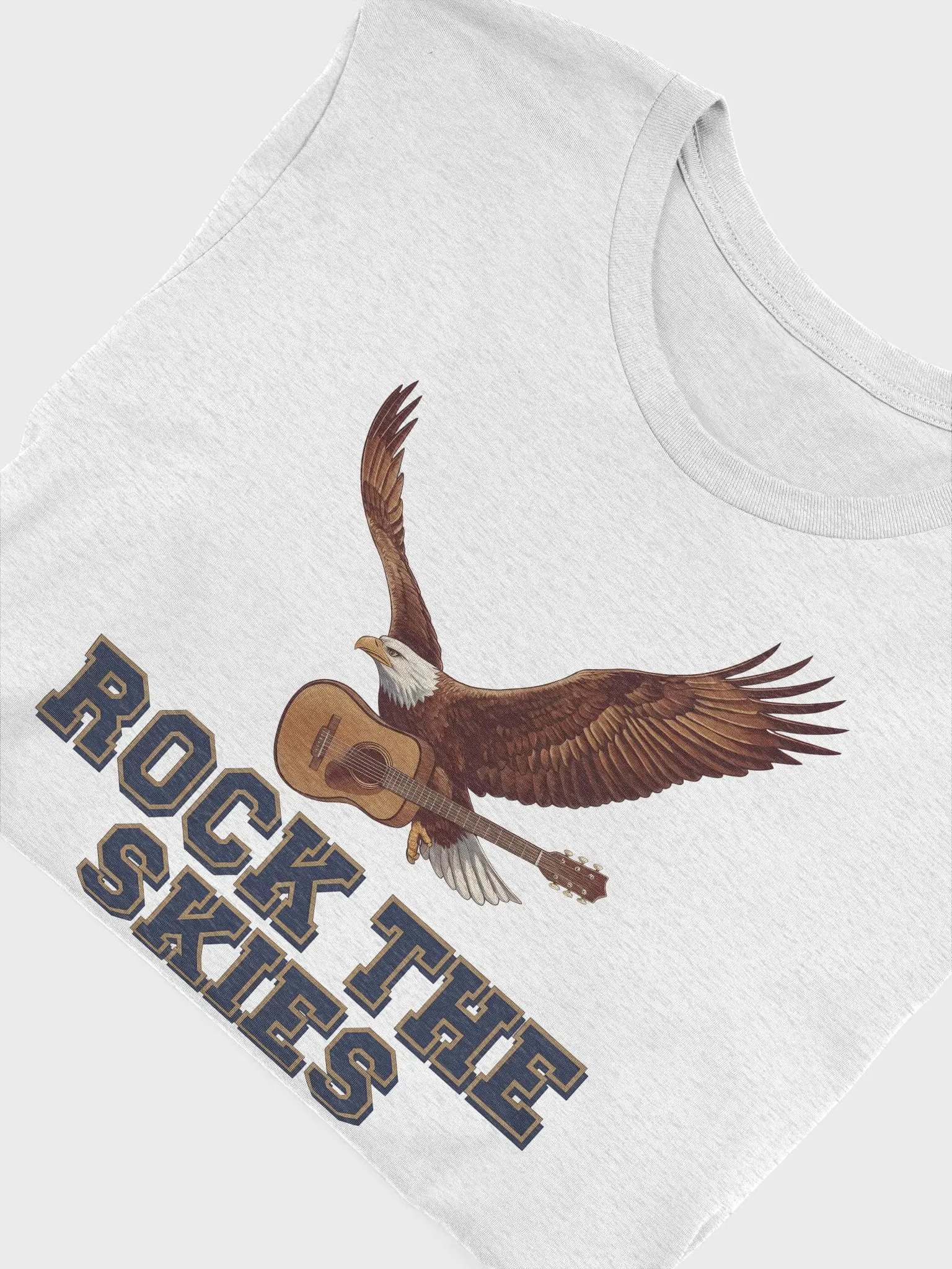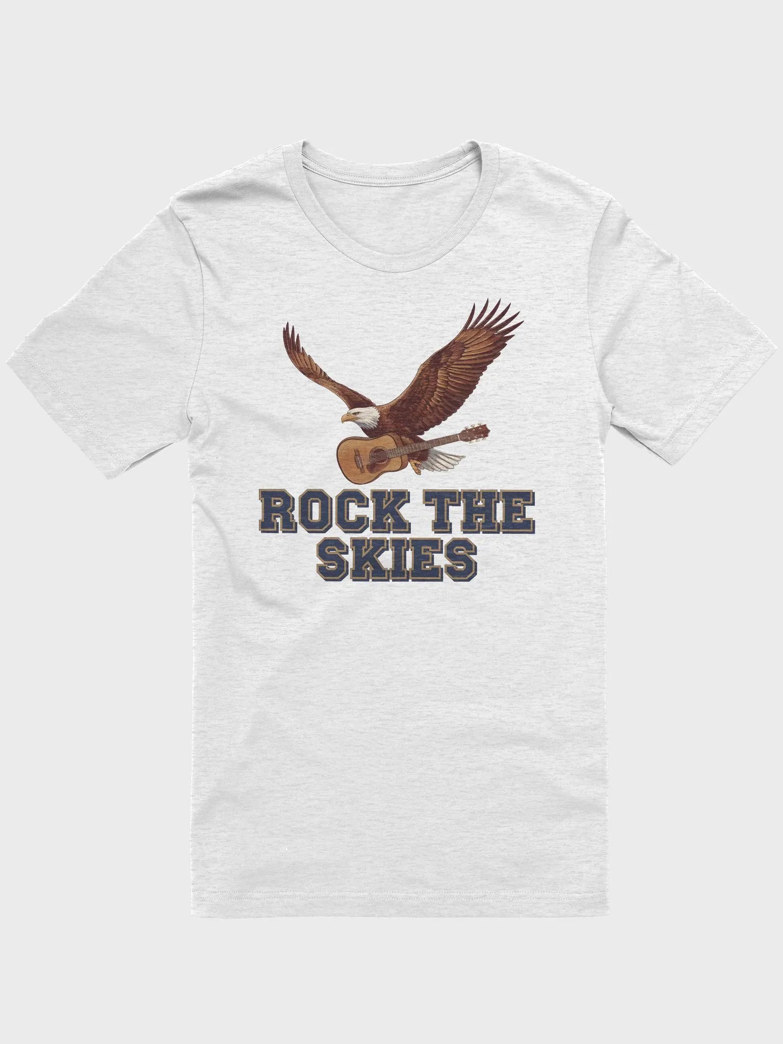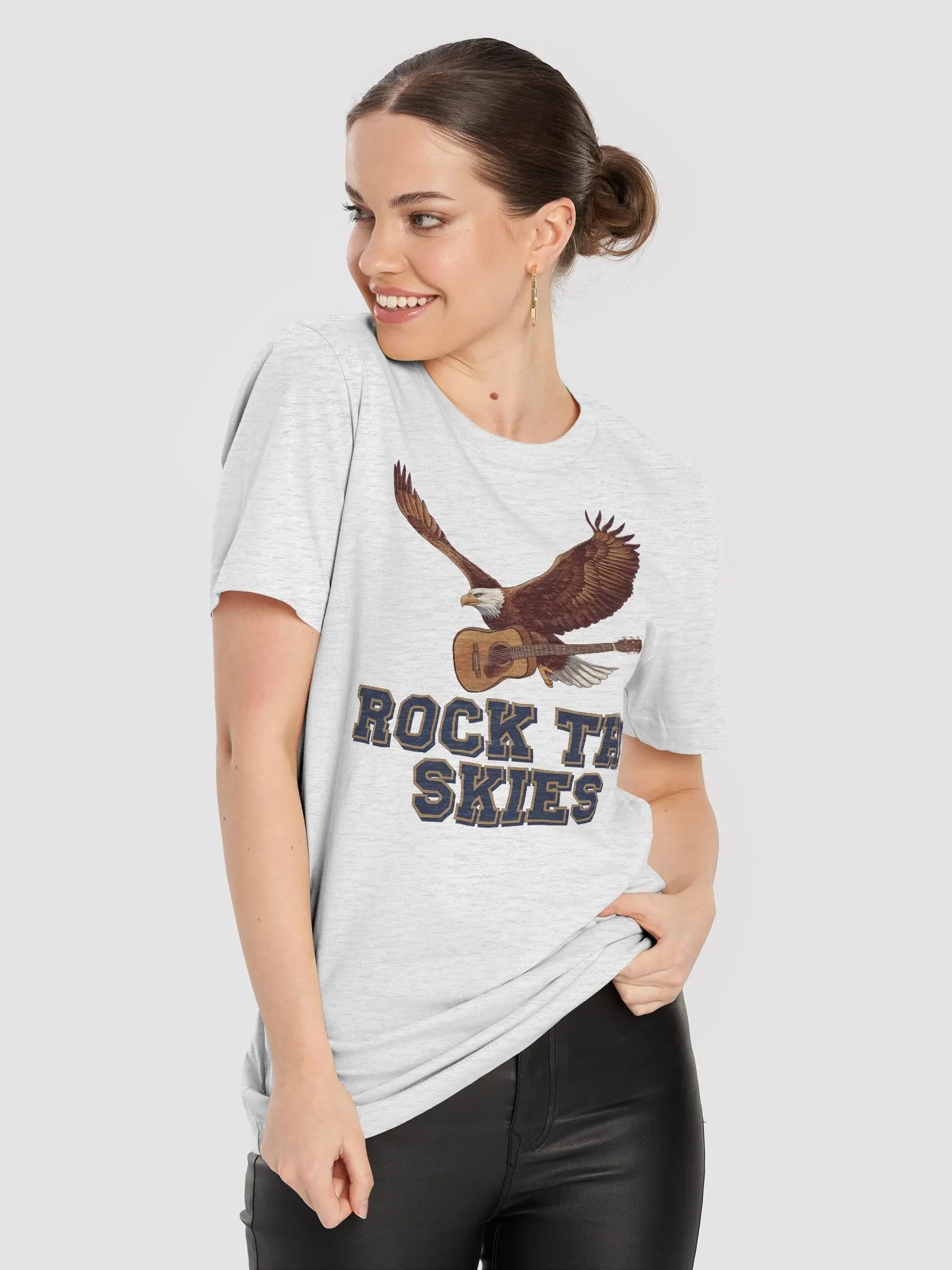 Elevate your wardrobe with this dynamic t-shirt featuring an awe-inspiring eagle in mid-flight, gripping a guitar. Emblazoned with the empowering message "ROCK THE SKIES", this shirt is perfect for music lovers and dreamers alike who are ready to conquer their day with confidence.