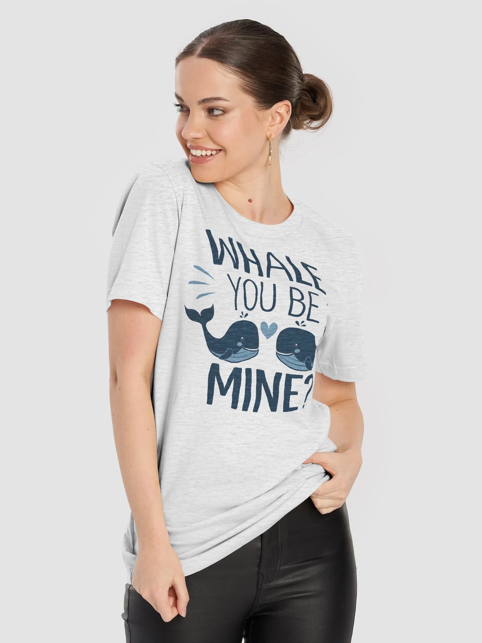 A playful t-shirt featuring two charming whales asking "WHALE YOU BE MINE?" in bold blue letters. Perfect for those who appreciate a pun-filled way to express affection.